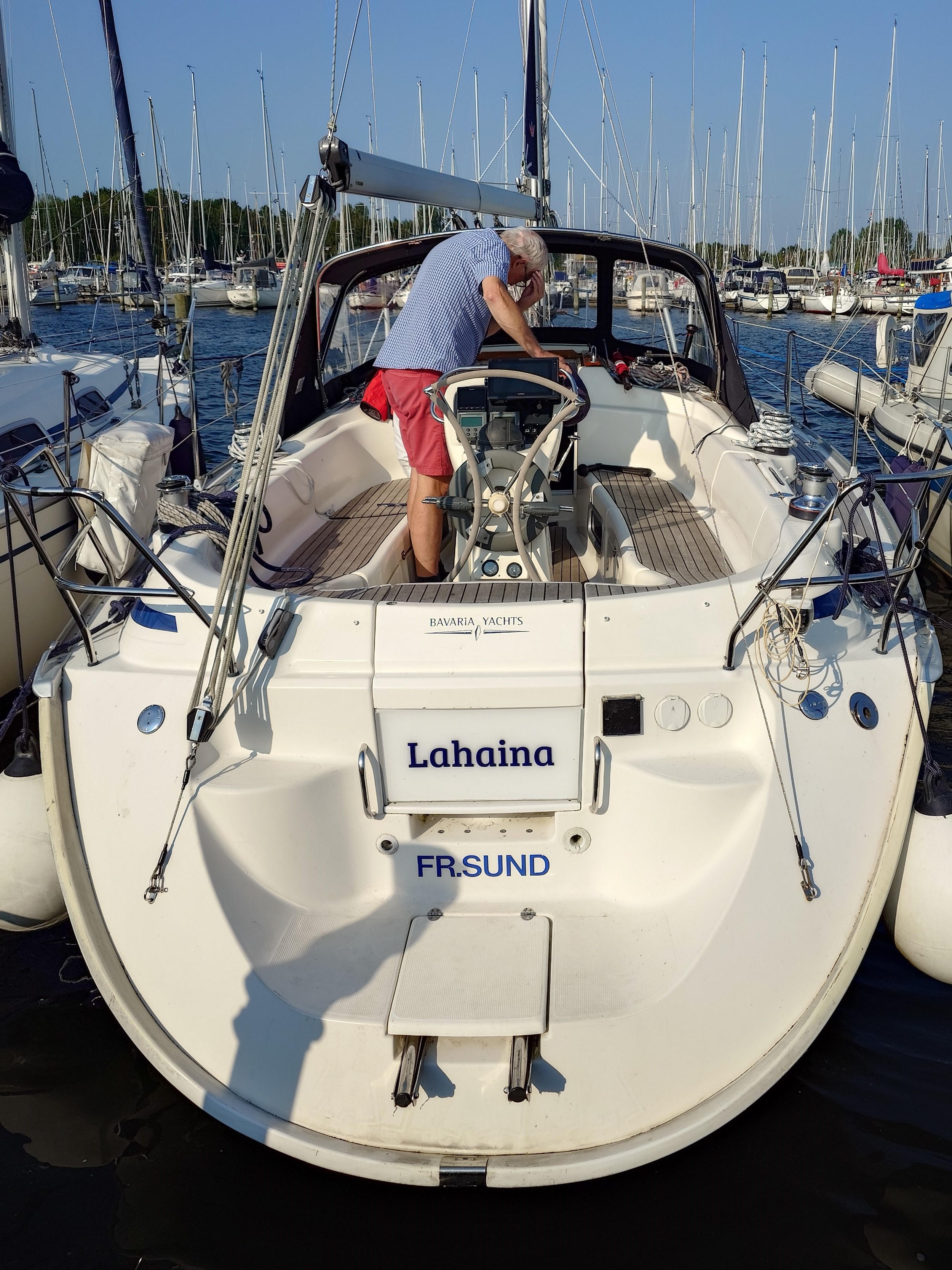 Båden gennemgås med sælgeren og de sidste detaljer kommer på plads inden afgang